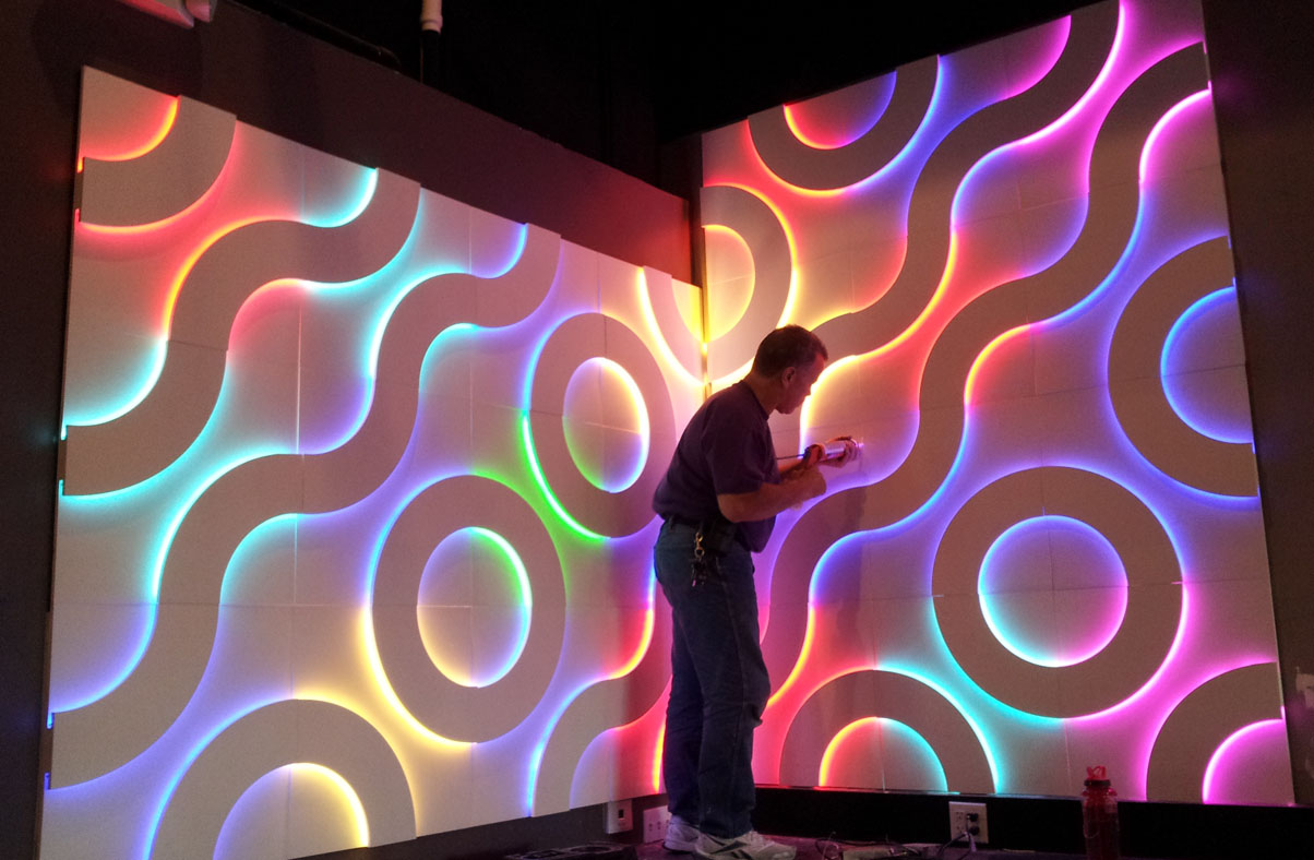 Located in Apopka Florida. Impact Lighting Inc. fabricated and installed custom its popular Galaxy Design System lit wall panels throughout the new expansion project. Impact used Color Changing LEDs in the wall pattern inorder to create a beautiful colorful glow at new bar area. These colorful treatments along with the concealed wall lighting and other lighting details created one of Impact Lighting Inc.'s most memorable restaurant designs.